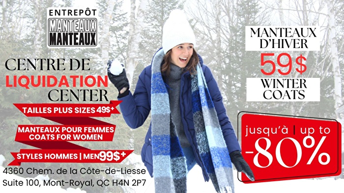 Get up to 80% off coats at the Manteaux Manteaux warehouse sale. Winter jackets for women on liquidation starting at 59$ & clothing is 50% off with an additional -30%. Shop discounts on styles for men starting at 99$ and plus sizes starting at 59$.